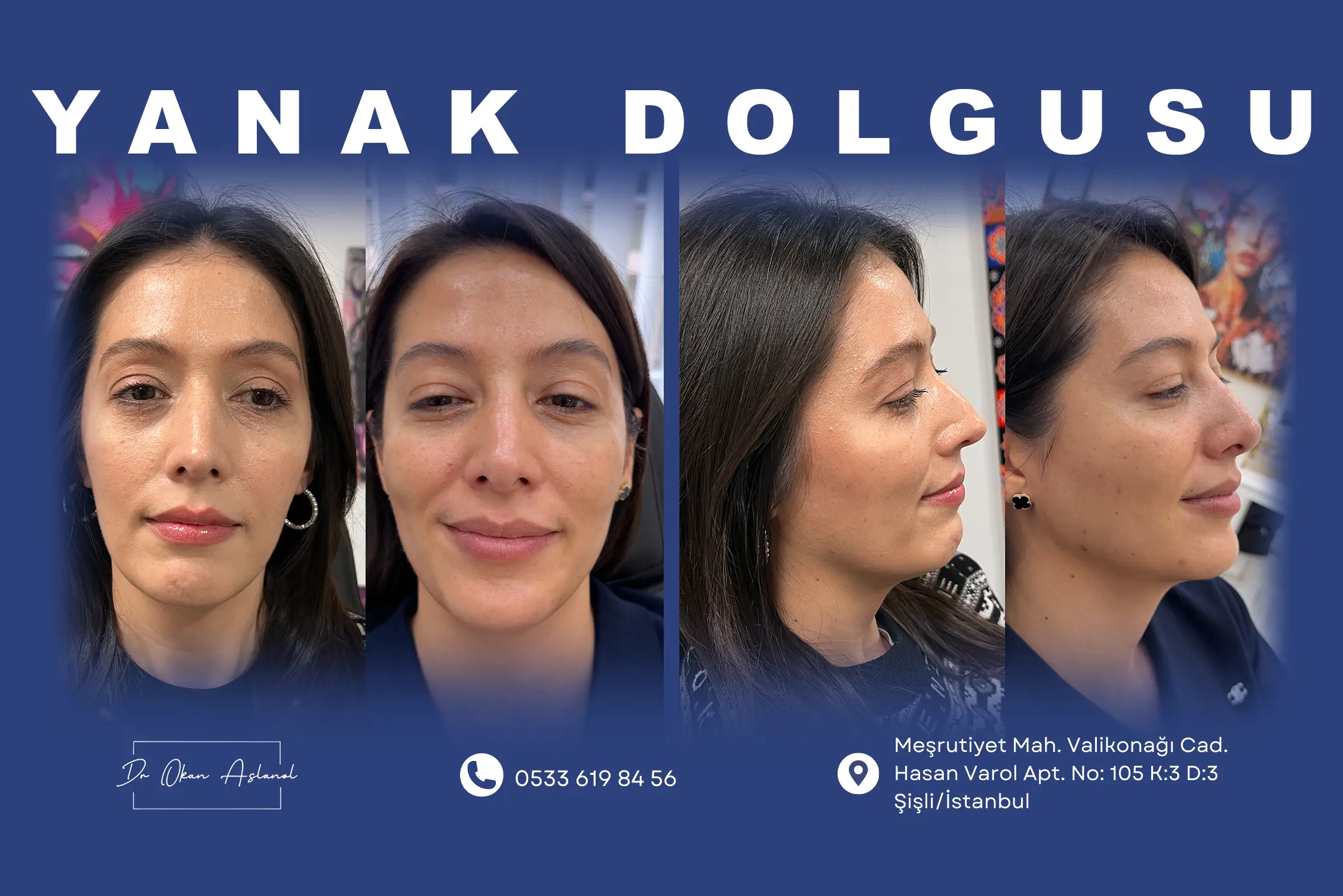 Yanak dolgusu, özellikle yüzün orta kısmındaki çöküklük ve hacim kayıplarını gidererek yorgun ifadeyi ortadan kaldırır. Belirsiz elmacık kemikleri, yüzdeki simetri bozuklukları ve yaşla birlikte aşağı doğru yer değiştiren dokuların yarattığı sarkma görüntüsü için etkili bir çözümdür.